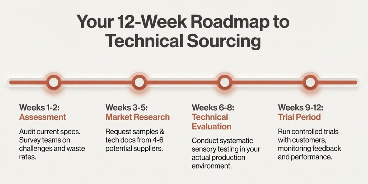 Phase 1 – Assessment (Weeks 1-2): Audit current specifications and supplier documentation. Survey operations teams on ingredient-related challenges—preparation difficulties, waste rates, customer feedback patterns.