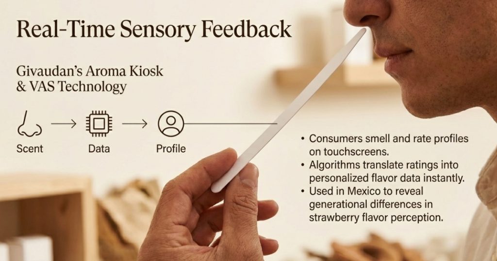 Givaudan’s Aroma Kiosk combines ATOM and Virtual Aroma Synthesizer (VAS) technologies to collect consumer insights and recommend products in real-time within retail environments like grocery stores and shopping malls. This compact mobile device features a user-friendly touchscreen. After consumers smell and rate different aroma profiles, an AI-based algorithm translates results into personalized flavor preferences. This data accelerates product development and increases successful launch probability. In Mexico, Givaudan deployed Aroma Kiosk to understand evolving consumer perceptions of fresh strawberry flavor, revealing generational differences in flavor and aroma perception.