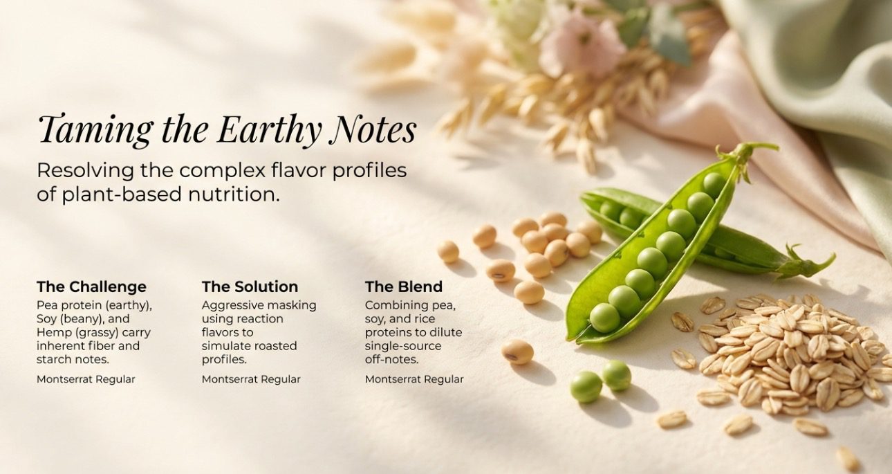 Plant proteins exhibit more intense beany, earthy, and chalky characteristics due to fiber and starch content. Pea protein requires aggressive masking with reaction flavors, soy protein needs multi-stage bitterness suppression. Nanotechnology improves solubility while protein blends (pea, soy, rice) dilute single-source off-notes. Solutions cost 15-25% more than whey protein systems but align with vegan and clean label market trends.