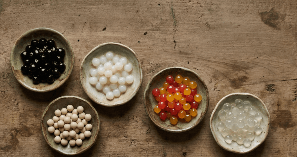 | Popping Boba | Fruit juice + sodium alginate | Bursts when bitten | Fruit teas, yogurt toppings | Ready to use, no cooking |