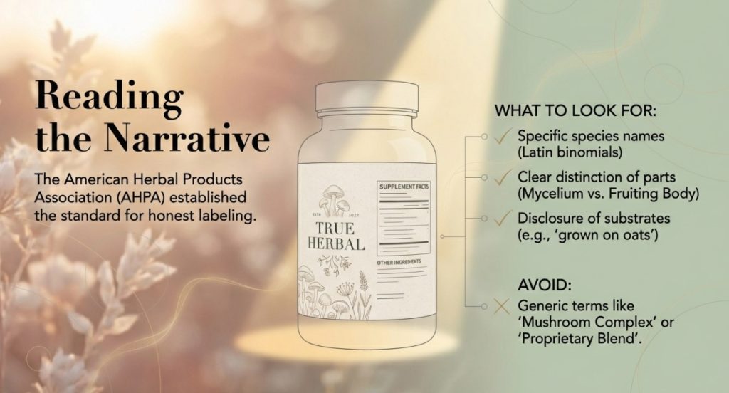 AHPA adopted fungal product labeling guidance in 2019 to establish industry standards. Supplement labels must identify fungal ingredients by common name, listed in order of predominance under the Supplement Facts heading. The fungal part or life stage requires specification even for extracts. When “mushroom” appears on the principal display panel, it must be modified with specific terms like “mushroom mycelium and fruitbodies” or general descriptors like “mushroom complex.” Nutrition labeling then provides detail, for example: “reishi mushroom composite (mycelium, fruitbody, spores).”
